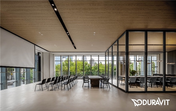 入觀內(nèi)室,這座Duravit的“上海舞臺”兩層空間主要由“臺前”和“幕后”兩個部分組成。旗艦店一樓主要由中心展示區(qū)及15個產(chǎn)品展示套間組成,對外直觀呈現(xiàn)Duravit的品牌價值和美學(xué)產(chǎn)品,共同敘寫Duravit的臺前故事。