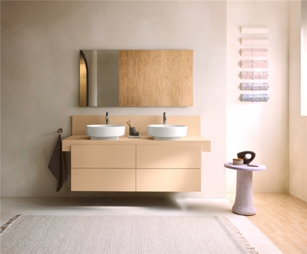 由Philippe Starck設(shè)計(jì)的White Tulip系列浴室家具搭配Bento Starck Box臺(tái)盆,采用精湛斜切邊工藝的龍頭與臺(tái)盆,完美契合優(yōu)雅精致的木質(zhì)家具,展現(xiàn)出精準(zhǔn)實(shí)用的構(gòu)造美學(xué)。浴室柜內(nèi)置多層分隔儲(chǔ)物空間,輕松收納洗漱用品,保持空間整潔有序。這種基于日常使用體驗(yàn)的設(shè)計(jì),不僅提升視覺(jué)美感,更以高效的功能性為雙人生活注入從容與和諧,仿佛每一次盥洗時(shí)光都在訴說(shuō)生活的條理與愛(ài)的默契。
